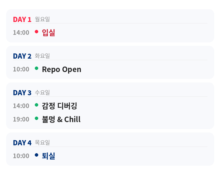 | 🔥 불멍 & Chill | PM의 독촉도, 배포 일정도 없는 밤. 모닥불 앞에서 오늘의 빌드 로그를 조용히 내려놓으세요. 말없이 불멍을 해도 좋고, 삽질 썰을 풀어도 좋은 시간입니다. |