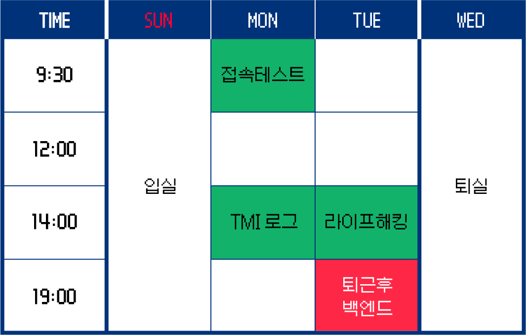 | 라이프해킹 | 업무와 일상에 대한 생각을 분류, 정리하고, 우선순위를 정해 7단계 실행 계획을 세웁니다. 코딩메이트들과 공유하며 실천을 다짐하는 소중한 시간입니다. |