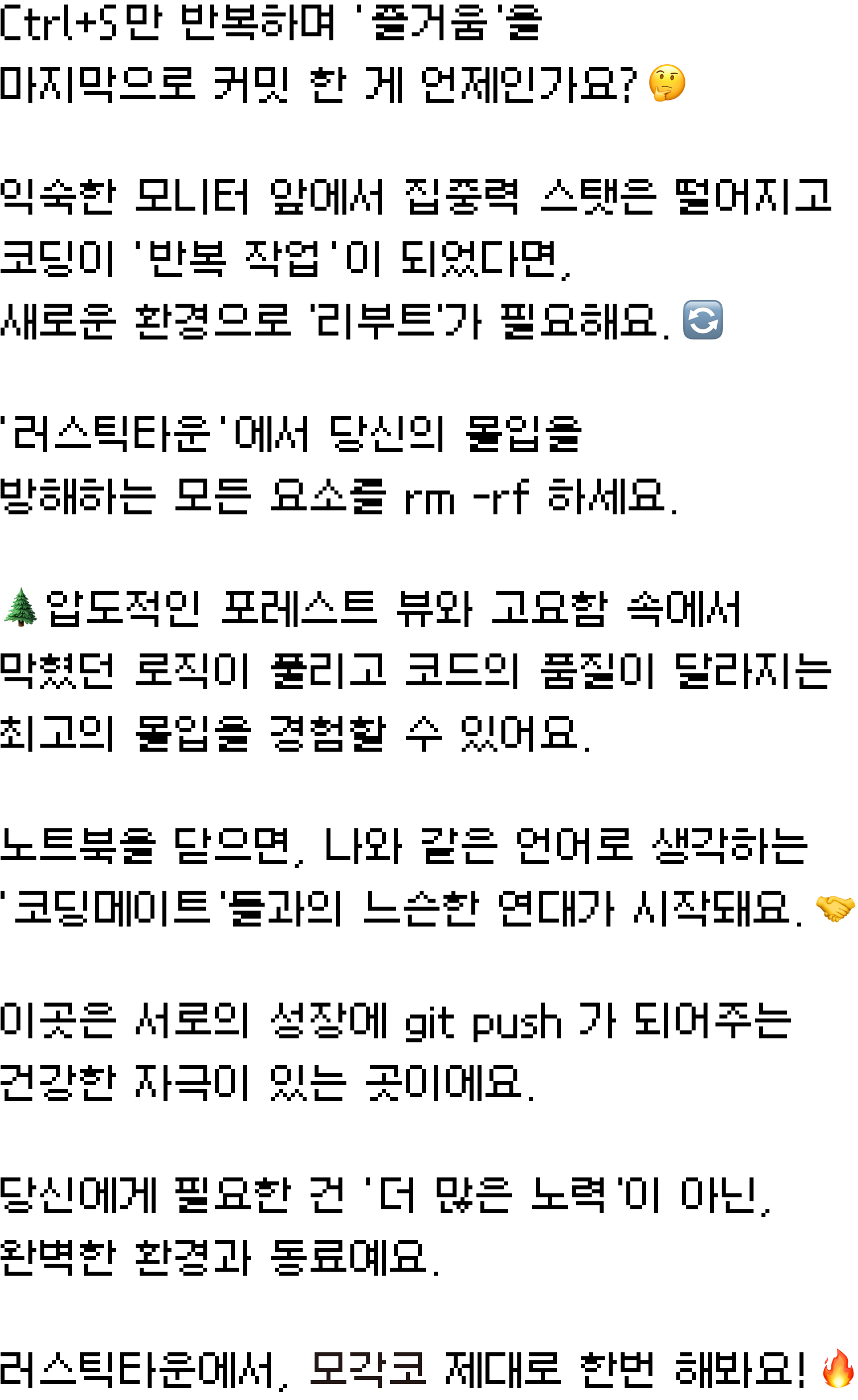 | 퇴근 후 백엔드 | 모험을 마친 <모칵코> 모딩메이트들이 지역 막걸리를 즐기고, 서로 성장을 응원하며 친밀감을 다지는 자연스러운 네트워크 시간입니다. |