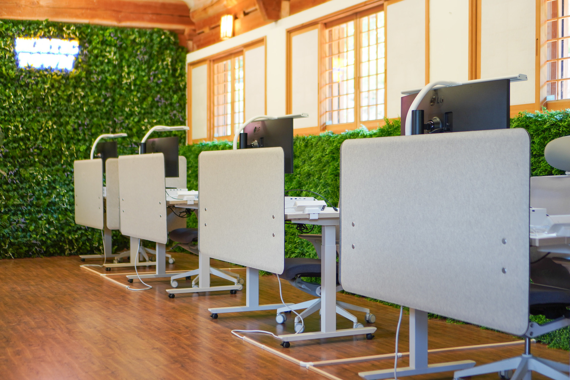 창밖으로 살랑이는 잎사귀와 푸른 산이 보이는 오픈 업무 공간입니다.